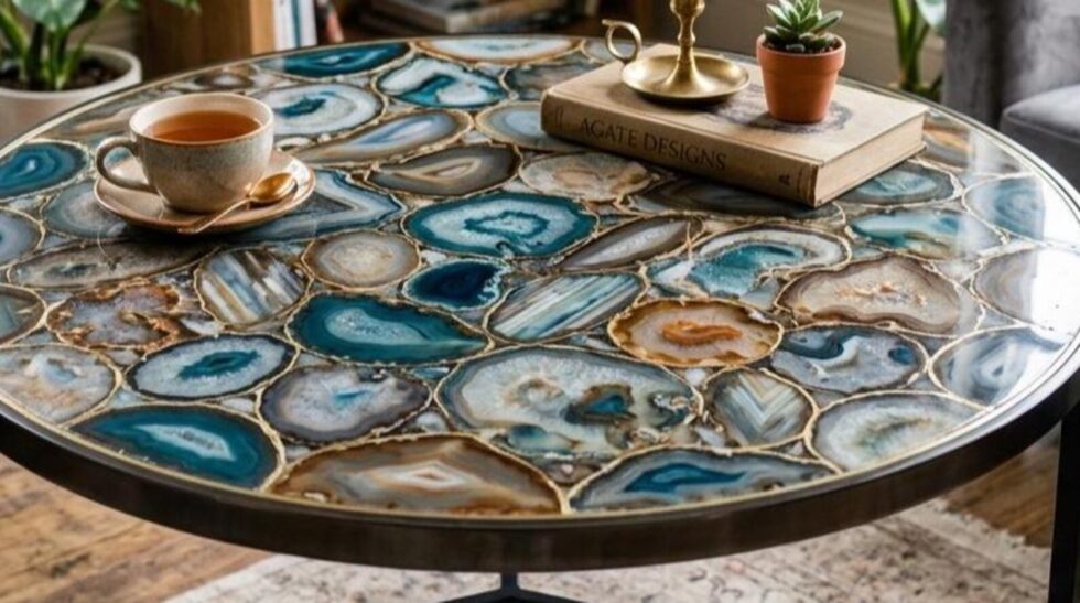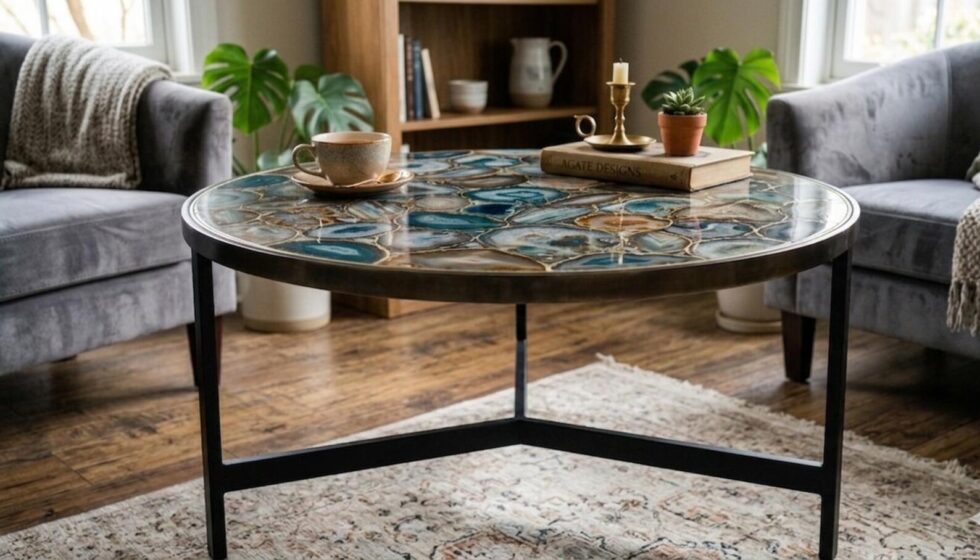 Round Blue Agate Coffee Table Top, Handmade Gemstone Luxury Furniture, Modern Interior Decor